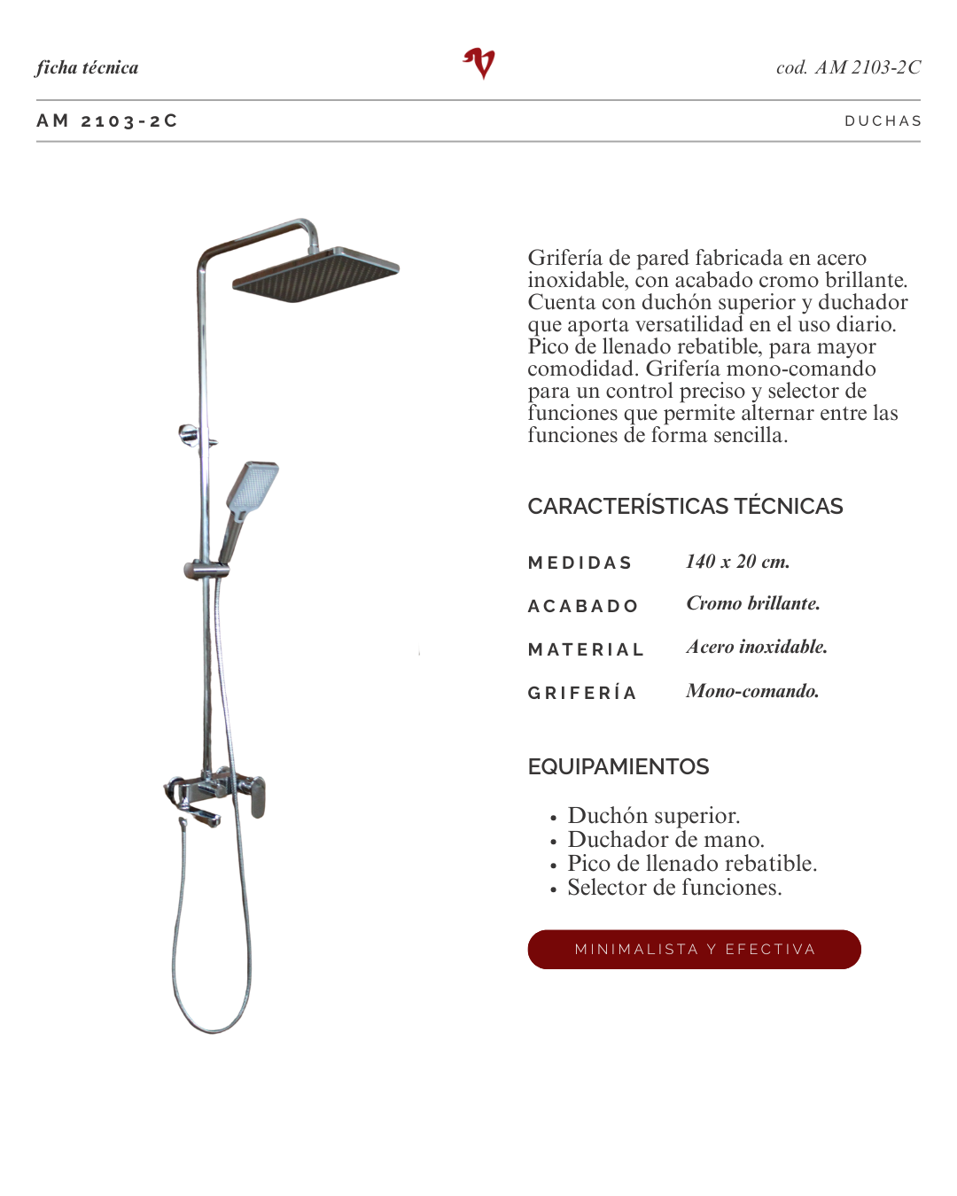 • Duchón superior que garantiza una caída de agua amplia y uniforme.